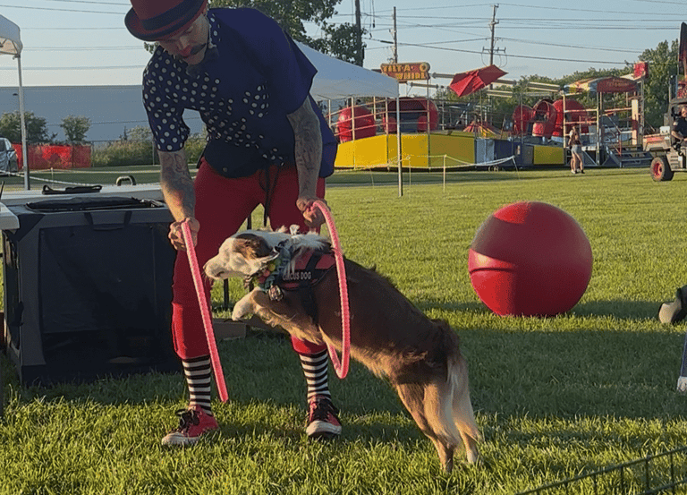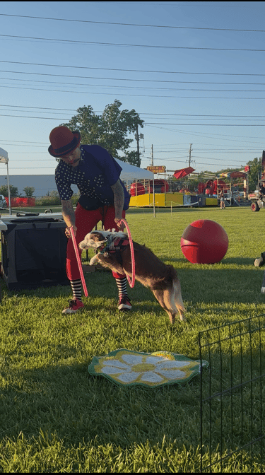 Watch our trained dog perform delightful tricks alongside the juggling act.